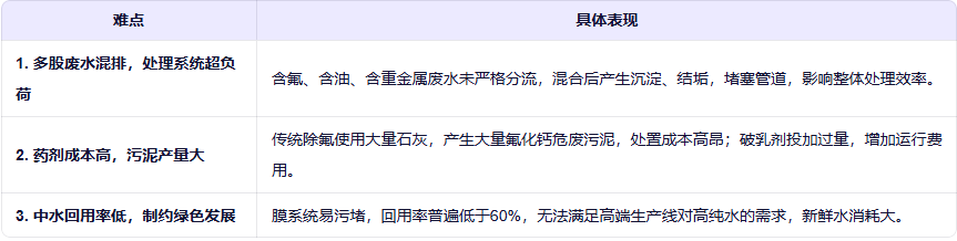 1. 源头分质,精准治理- 建立独立管网系统,实现含氟、含油、含重金属、酸碱废水四类分流;- 含氟废水采用“高效沉淀+过滤”或“电絮凝+膜处理”组合工艺,确保F⁻稳定达标;- 含油废水通过“破乳+气浮+超滤”预处理,去除乳化油和悬浮物。