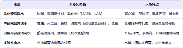 化妆品生产涵盖乳化、调配、灌装、清洗等多个环节,其废水来源多样,水质复杂,主要特征如下: